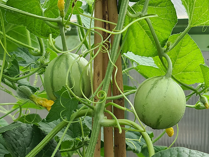 Toch blijft meloen kweken als kruipende plant het beste dat je kunt doen. De vruchten worden dan ook vaak groter. Als klimplant moet de meloen veel vocht omhoog pompen, naar de vruchten toe. De zwaartekracht zit niet mee en hier kunnen de meloenen net ietsje kleiner door worden. Het blijft een afweging tussen grote vruchten en gemak, of ruimtebesparing.